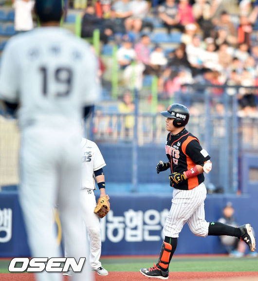 9일 오후 창원시 마산 야구장서 열린 '2015 타이어뱅크 KBO 리그' NC 다이노스와 롯데 자이언츠의 경기, 5회초 선두타자 롯데 강민호가 우월 솔로홈런을 날린 후 그라운드를 돌고 있다.