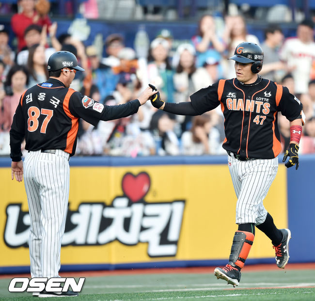 9일 오후 창원시 마산 야구장서 열린 '2015 타이어뱅크 KBO 리그' NC 다이노스와 롯데 자이언츠의 경기, 5회초 선두타자 롯데 강민호가 우월 솔로홈런을 날린 후 3루에서 김응국 코치와 하이파이브를 하고 있다.