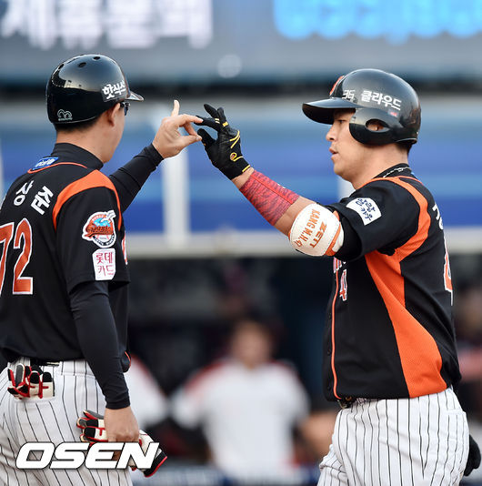 9일 오후 창원시 마산 야구장서 열린 '2015 타이어뱅크 KBO 리그' NC 다이노스와 롯데 자이언츠의 경기, 5회초 선두타자 롯데 강민호가 우월 솔로홈런을 날린 후 홈에서 안상준 코치와 하이파이브를 하고 있다.