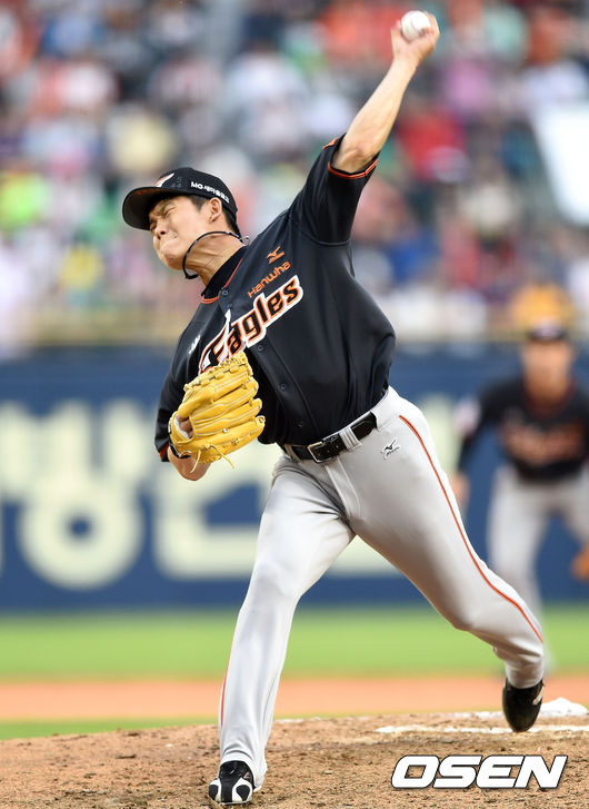 6최호 1사 2루에서 한화 박정진이 힘차게 공을 던지고 있다.