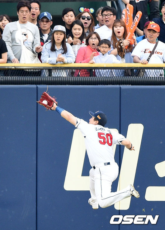7회초 무사에서 두산 김현수가 한화 권용관의 타구를 잡고 있다.