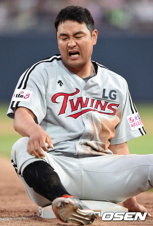 9일 오후 경기도 수원시 수원kt위즈파크에서 열린 '2015 타이어뱅크 KBO 리그' kt 위즈와 LG 트윈스의 경기 6회초 2사 1루 박지규의 좌전안타에 3루까지 쇄도하던 1루주자 최경철이 아웃당하고 지친 표정을 하고 있다.