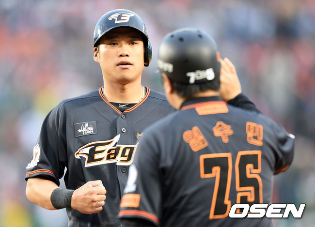 7회초 2사 1,3루에서 한화 최진행이 좌중간을 가르는 적시타를 치고 임수민 코치와 하이파이브를 하고 있다.