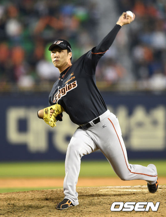 9회말 한화 권혁이 힘차게 공을 던지고 있다.