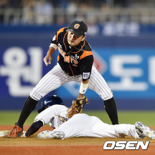 9일 오후 창원시 마산 야구장서 열린 '2015 타이어뱅크 KBO 리그' NC 다이노스와 롯데 자이언츠의 경기, 8회말 2사 주자 1,3루 NC 김종호 타석에서 1루 주자 최재원이 2루 도루에 성공하고 있다.