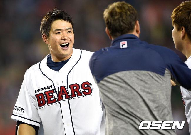 9회말 2사 1,2루에서 좌전 적시타를 친 김재환이 동료들과 승리의 기쁨을 나누고 있다./sunday@osen.co.kr