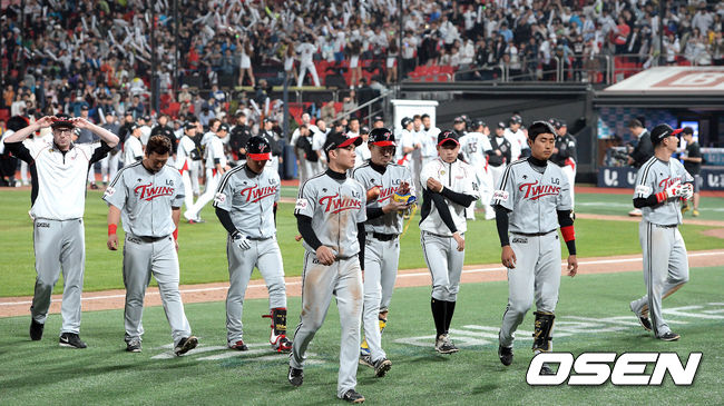 9일 오후 경기도 수원시 수원kt위즈파크에서 열린 '2015 타이어뱅크 KBO 리그' kt 위즈와 LG 트윈스의 경기 종료 후 LG 선수들이 관중들에게 인사를 하고 그라운드를 빠져나가고 있다.