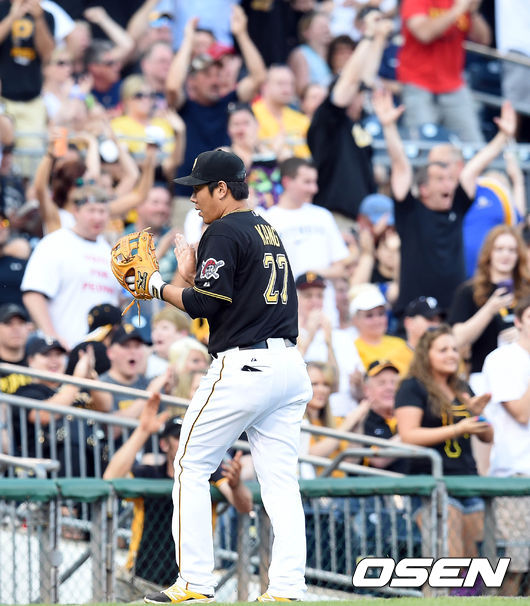 메이저리그서 28년만에 나온 주자 2,3루 상황 트리플 플레이를 성공시킨 강정호와 워커의 플레이에 피츠버그팬들이 환호하고 있다.