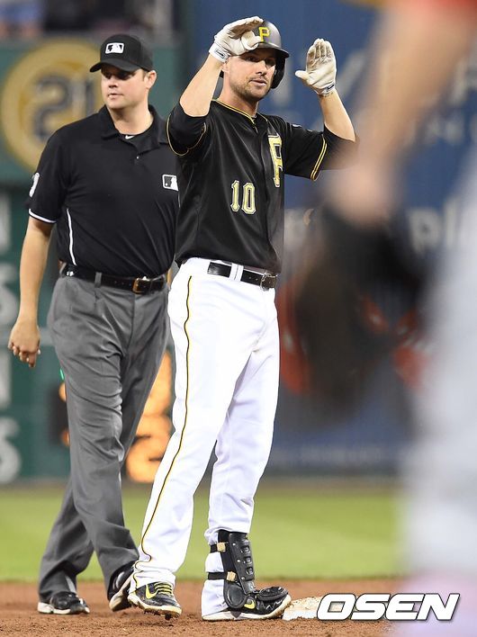 7회말 피츠버그 공격 1사 만루 상황 조디 머서거 역전 2타점 좌중간 인정 2루타른 날리고 2루에 안착해 기뻐하고 있다.