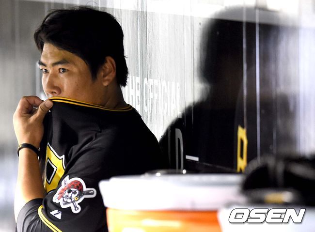 8회말 피츠버그 공격 1사 2루 상황 강정호가 헛스윙 삼진으로 물러난 뒤 더그아웃에서 그라운드를 바라보고 있다.