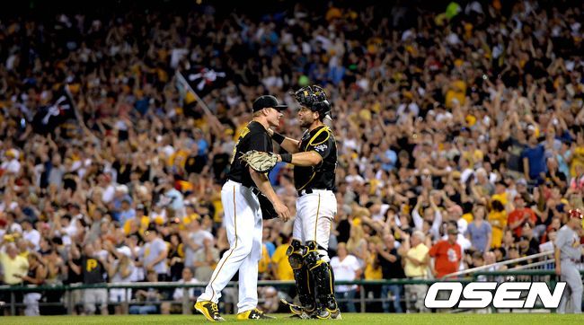 경기 종료 후 피츠버그 마무리투수 마크 멜란슨과 포수 프란시스코 서벨리가 인사를 나누고 있다./dreamer@osen.co.kr