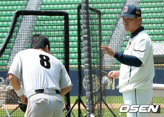 10일 오후 서울 잠실구장에서 열린 '2015 타이어뱅크 KBO리그' 두산 베어스와 한화 이글스의 경기, 경기에 앞서 두산 박철우 코치와 한화 정근우가 이야기를 나누고 있다.