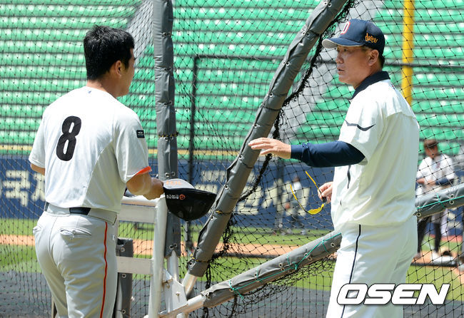 10일 오후 서울 잠실구장에서 열린 '2015 타이어뱅크 KBO리그' 두산 베어스와 한화 이글스의 경기, 경기에 앞서 두산 박철우 코치와 한화 정근우가 이야기를 나누고 있다.