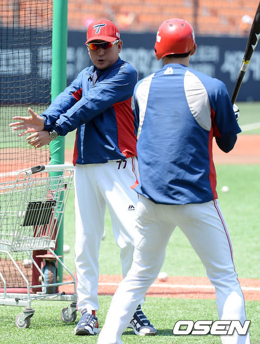 10일 오후 서울 목동야구장에서 열린 '2015 타이어뱅크 KBO 리그' 넥센 히어로즈와 KIA 타이거즈의 경기, 경기시작전 KIA 김기태 감독이 이홍구에게 타격지도하고 있다.