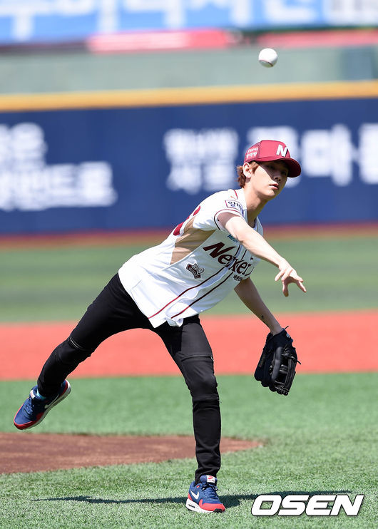 10일 오후 서울 목동야구장에서 열린 '2015 타이어뱅크 KBO 리그' 넥센 히어로즈와 KIA 타이거즈의 경기, 경기시작전 그룹 비투비 일훈이 시구하고 있다.