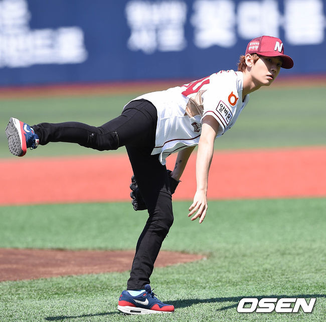 10일 오후 서울 목동야구장에서 열린 '2015 타이어뱅크 KBO 리그' 넥센 히어로즈와 KIA 타이거즈의 경기, 경기시작전 비투비 일훈이 시구하고 있다.