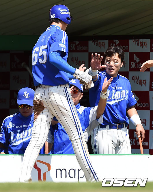 10일 오후 인천광역시 인천SK행복드림구장에서 열린 '2015 타이어뱅크 KBO 리그' SK 와이번스와 삼성 라이온즈의 경기 1회초 1사 3루 나바로의 희생플라이에 득점한 구자욱이 이승엽과 하이파이브를 하고 있다.