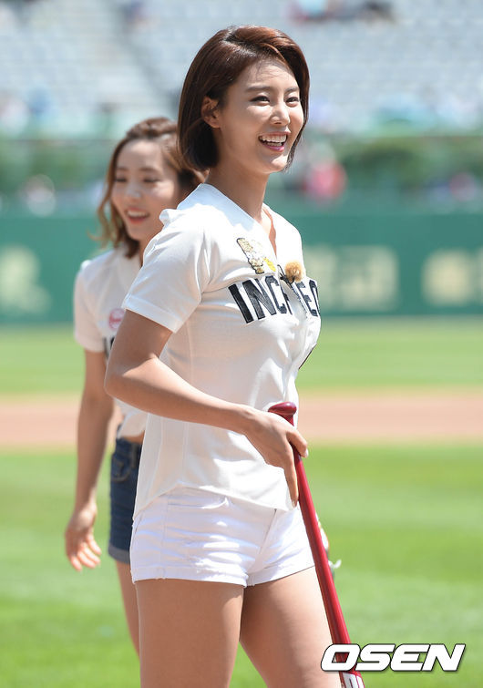 10일 오후 인천광역시 인천SK행복드림구장에서 열린 '2015 타이어뱅크 KBO 리그' SK 와이번스와 삼성 라이온즈의 경기 시작전 로지가 시타를 하고 미소를 짓고 있다.