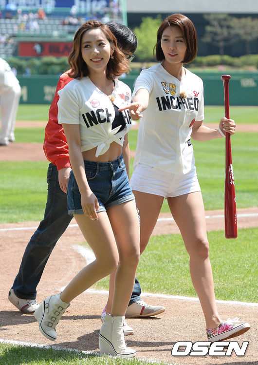 10일 오후 인천광역시 인천SK행복드림구장에서 열린 '2015 타이어뱅크 KBO 리그' SK 와이번스와 삼성 라이온즈의 경기 시작전 정순주 아나운서와 로지가 시구 시타를 하고 미소를 짓고 있다.