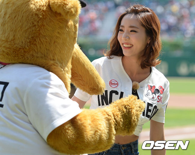 10일 오후 인천광역시 인천SK행복드림구장에서 열린 '2015 타이어뱅크 KBO 리그' SK 와이번스와 삼성 라이온즈의 경기 시작전 정순주 아나운서가 시구를 마치고 마스코트와 인사를 나누고 있다.