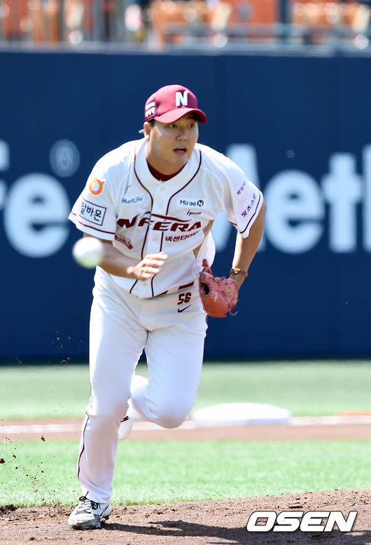 10일 오후 서울 목동야구장에서 열린 '2015 타이어뱅크 KBO 리그' 넥센 히어로즈와 KIA 타이거즈의 경기, 1회초 넥센 김동준이 수비 백업을 위해 1루로 향하고 있다.
