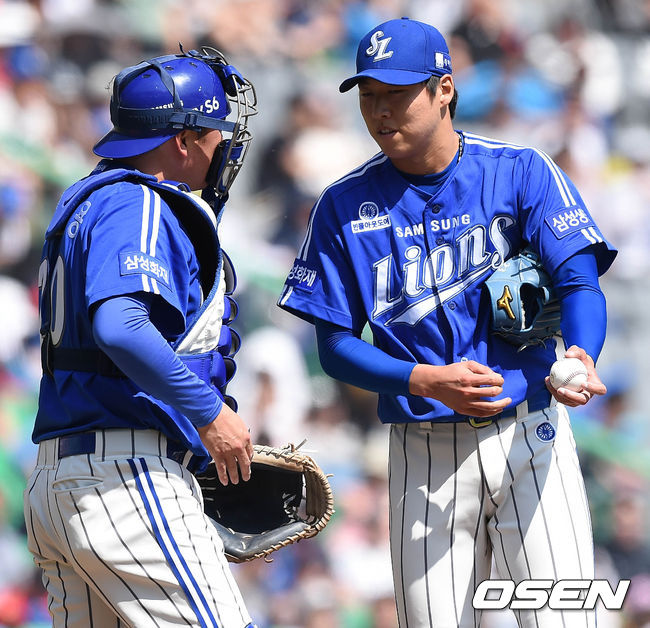 10일 오후 인천광역시 인천SK행복드림구장에서 열린 '2015 타이어뱅크 KBO 리그' SK 와이번스와 삼성 라이온즈의 경기 2회말 진갑용과 차우찬이 이야기를 나누고 있다.
