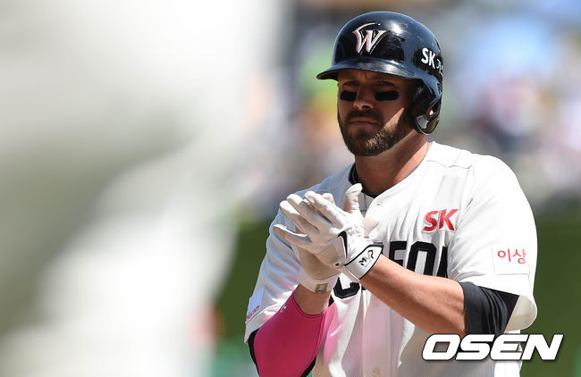 10일 오후 인천광역시 인천SK행복드림구장에서 열린 '2015 타이어뱅크 KBO 리그' SK 와이번스와 삼성 라이온즈의 경기 2회말 2사 만루 브라운이 2타점 적시타를 치고 박수를 치고 있다.