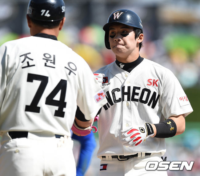 10일 오후 인천광역시 인천SK행복드림구장에서 열린 '2015 타이어뱅크 KBO 리그' SK 와이번스와 삼성 라이온즈의 경기 3회말 1사 3루 박계현이 1타점 적시타를 치고 조원우 코치와 하이파이브를 하고 있다.