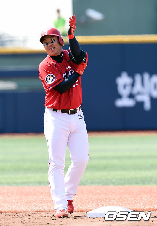 10일 오후 서울 목동야구장에서 열린 '2015 타이어뱅크 KBO 리그' 넥센 히어로즈와 KIA 타이거즈의 경기, 4회말 무사 주자 1,3루 KIA 이범호가 1타점 적시타를 치고 2루를 밟고 있다.