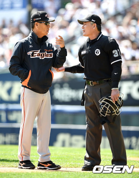 10일 오후 서울 잠실구장에서 열린 '2015 타이어뱅크 KBO리그' 두산 베어스와 한화 이글스의 경기, 3회초 무사 1루에서 한화 탈보트가 두산 민병헌 타석에 보크 판정에 불만을 나타내며 퇴장당하자 김성근 감독이 그라운드에 올라 김병주 구심과 이야기를 나누고 있다.