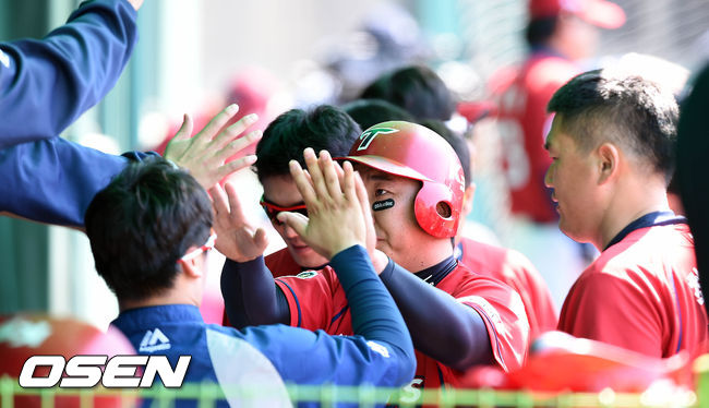 10일 오후 서울 목동야구장에서 열린 '2015 타이어뱅크 KBO 리그' 넥센 히어로즈와 KIA 타이거즈의 경기, 4회초 2사 주자 2,3루 KIA 오준혁의 안타에 홈을 밟은 이범호가 더그아웃에서 기쁨을 나누고 있다.