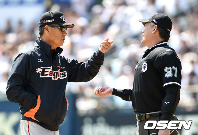 10일 오후 서울 잠실구장에서 열린 '2015 타이어뱅크 KBO리그' 두산 베어스와 한화 이글스의 경기, 3회초 무사 1루에서 한화 탈보트가 두산 민병헌 타석에 보크 판정에 불만을 나타내며 퇴장당하자 김성근 감독이 그라운드에 올라 김병주 구심과 이야기를 나누고 있다.