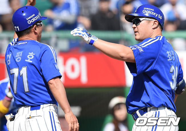 10일 오후 인천광역시 인천SK행복드림구장에서 열린 '2015 타이어뱅크 KBO 리그' SK 와이번스와 삼성 라이온즈의 경기 4회초 1사 최형우가 솔로홈런을 치고 김평호 코치와 하이파이브를 하고 있다.