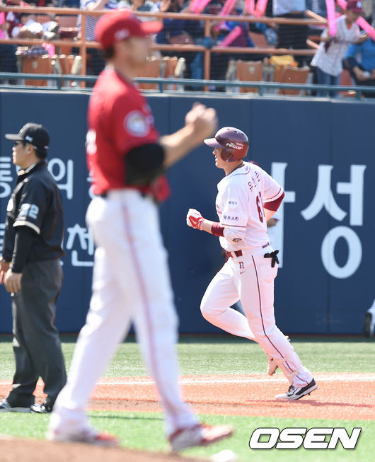 10일 오후 서울 목동야구장에서 열린 '2015 타이어뱅크 KBO 리그' 넥센 히어로즈와 KIA 타이거즈의 경기, 4회말 무사 주자 2루 넥센 유한준이 투런을 치고 주루하고 있다.
