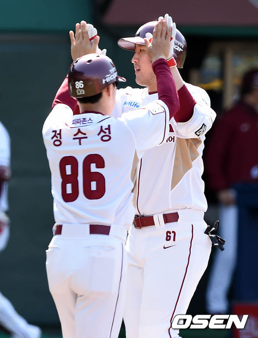 10일 오후 서울 목동야구장에서 열린 '2015 타이어뱅크 KBO 리그' 넥센 히어로즈와 KIA 타이거즈의 경기, 4회말 무사 주자 2루 넥센 유한준이 투런을 치고 정수성 코치와 기쁨을 나누고 있다.