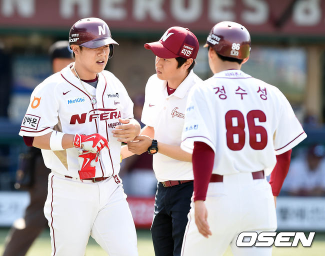 10일 오후 서울 목동야구장에서 열린 '2015 타이어뱅크 KBO 리그' 넥센 히어로즈와 KIA 타이거즈의 경기, 4회말 무사 주자 없는 상황 넥센 윤석민이 몸에 맞는 공으로 출루하고 있다.