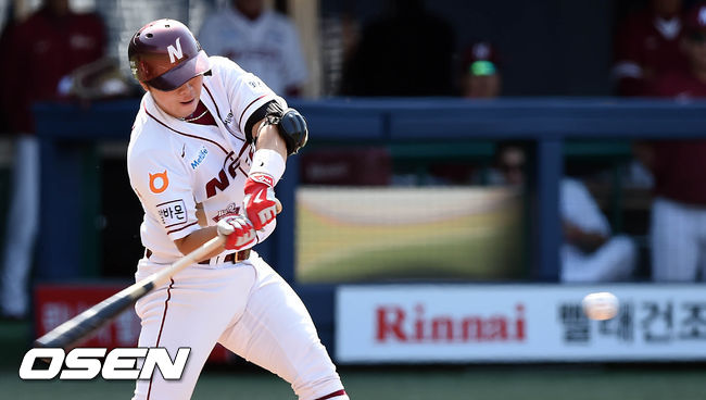 10일 오후 서울 목동야구장에서 열린 '2015 타이어뱅크 KBO 리그' 넥센 히어로즈와 KIA 타이거즈의 경기, 4회말 2사 주자 2루 넥센 김재현이 투런을 치고 있다.