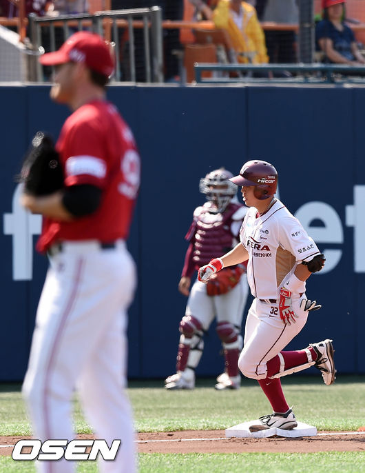 10일 오후 서울 목동야구장에서 열린 '2015 타이어뱅크 KBO 리그' 넥센 히어로즈와 KIA 타이거즈의 경기, 4회말 2사 주자 1루 넥센 김재현이 투런을 치고 있다.
