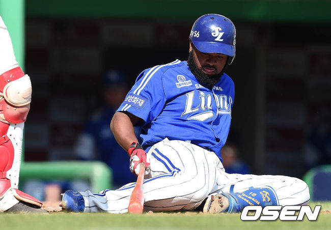 10일 오후 인천광역시 인천SK행복드림구장에서 열린 '2015 타이어뱅크 KBO 리그' SK 와이번스와 삼성 라이온즈의 경기 5회초 2사 만루 나바로가 몸쪽 공을 피하다 뒤로 주저 앉고 있다.