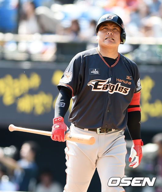 10일 오후 서울 잠실구장에서 열린 '2015 타이어뱅크 KBO리그' 두산 베어스와 한화 이글스의 경기, 4회초 2사에서 한화 김태균이 헛스윙 삼진으로 물러나며 아쉬워하고 있다.