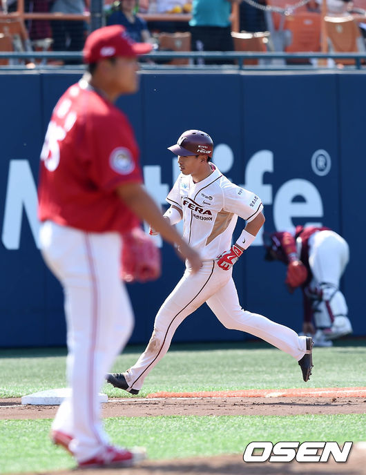 10일 오후 서울 목동야구장에서 열린 '2015 타이어뱅크 KBO 리그' 넥센 히어로즈와 KIA 타이거즈의 경기, 4회말 2사 주자 1루 넥센 고종욱이 투런을 치고 주루하고 있다.