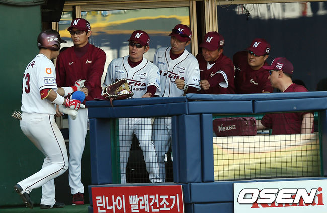 10일 오후 서울 목동야구장에서 열린 '2015 타이어뱅크 KBO 리그' 넥센 히어로즈와 KIA 타이거즈의 경기, 4회말 2사 주자 2루 넥센 고종욱이 투런을 치고 더그아웃에서 기쁨을 나누고 있다.