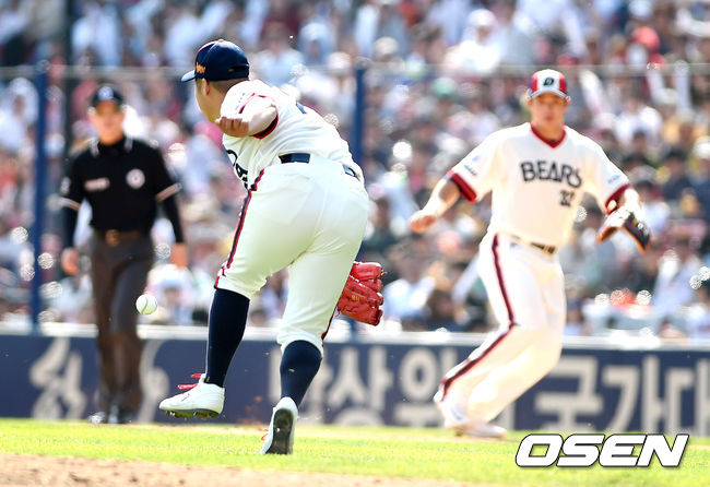 10일 오후 서울 잠실구장에서 열린 '2015 타이어뱅크 KBO리그' 두산 베어스와 한화 이글스의 경기, 6회초 무사에서 한화 한상훈의 1루 땅볼 타구를 두산 유희관이 놓치고 있다.