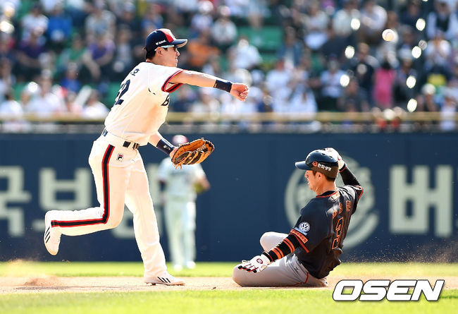 10일 오후 서울 잠실구장에서 열린 '2015 타이어뱅크 KBO리그' 두산 베어스와 한화 이글스의 경기, 6회초 무사 1루에서 한화 강경학의 2루 땅볼에 두산 김재호가 한상훈을 포스아웃시키고 1루로 송구하고 있다.