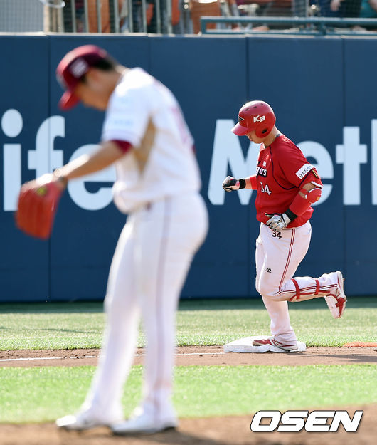 10일 오후 서울 목동야구장에서 열린 '2015 타이어뱅크 KBO 리그' 넥센 히어로즈와 KIA 타이거즈의 경기, 7회초 1사 주자 없는 상황 KIA 이홍구가 솔로홈런을 치고 주루하고 있다.