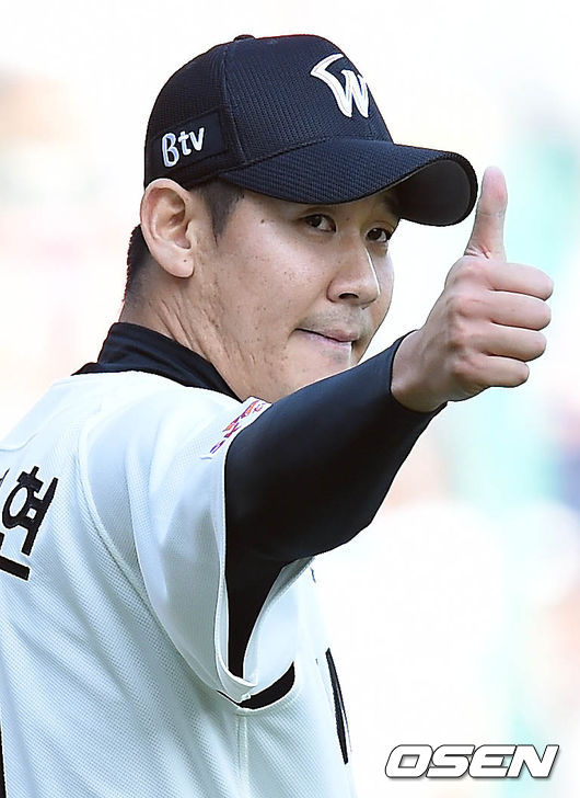 10일 오후 인천광역시 인천SK행복드림구장에서 열린 '2015 타이어뱅크 KBO 리그' SK 와이번스와 삼성 라이온즈의 경기 종료 후 윤길현이 1루수 박정권을 향해 엄지를 보이고 있다.