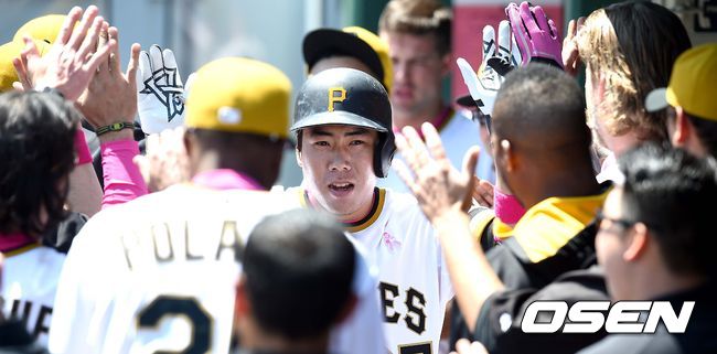 1회말 피츠버그 공격 1사 주자없는 상황 강정호가 선제 좌월 솔로포를 날리고 홈을 밟은 뒤 더그아웃 동료들과 인사를 나누고 있다.