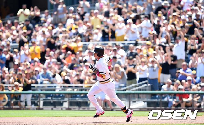 1회말 피츠버그 공격 1사 주자없는 상황 강정호가 선제 좌월 솔로포를 날리고 그라운드를 돌고 있다.