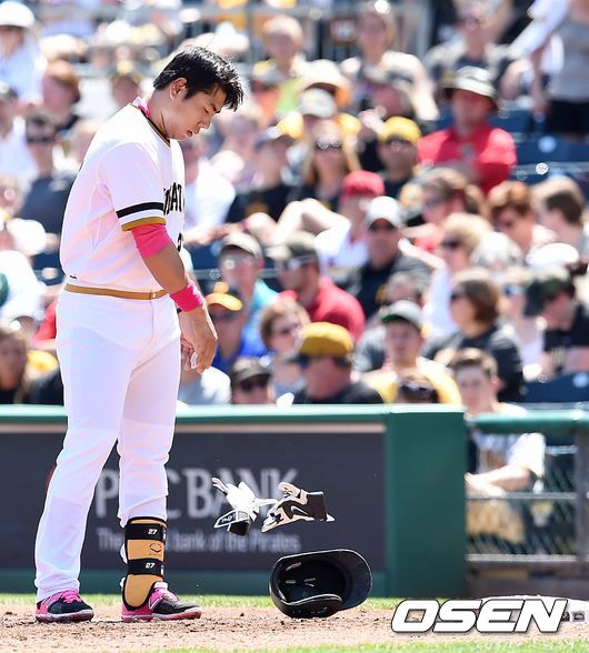 3회말 피츠버그 공격 2사 주자없는 상황 강정호가 내야 땅볼을 치고 아쉬워하고 있다.