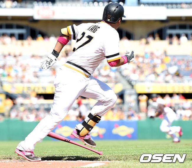 7회말 피츠버그 공격 1사 2루 상황 강정호가 도망가는 1타점 적시 좌전안타를 날리고 타구를 확인하며 1루로 뛰고 있다.
